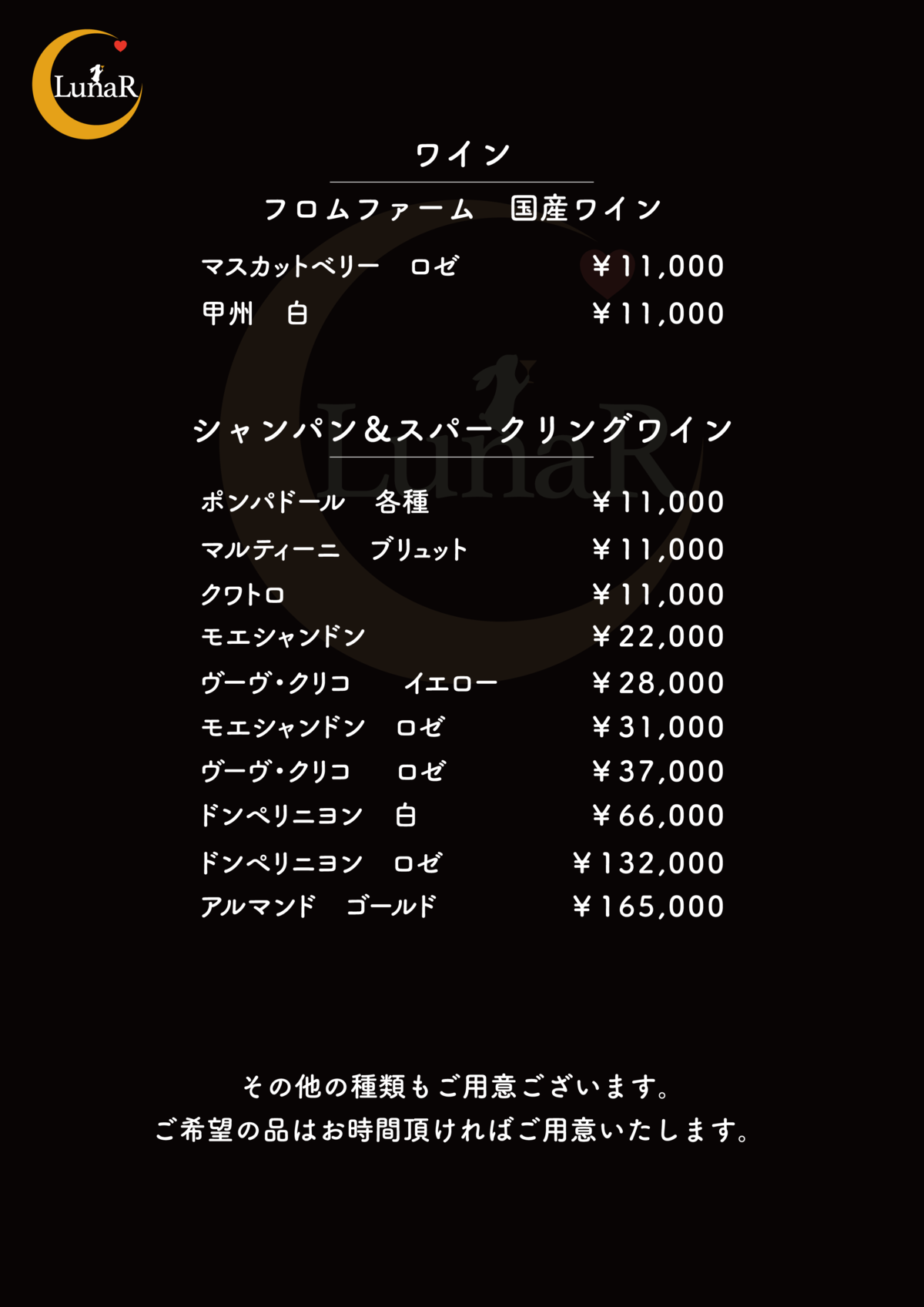 ボトル注文の方はアイス、ミネラルウォーター、お茶類その他の割材がセットに含まれます。